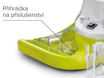 Veškeré příslušenství můžete uložit do praktické přihrádky nacházející se v těle inhalátoru a mít ho tak vždy po ruce. Pro snadné přenášení je inhlatátor vybaven praktickým madlem. Nechybí ani navíječ napájecího kabelu.