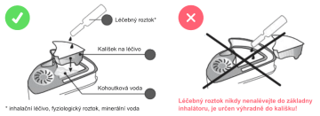 inhalační léčivo, fyziologický roztok nebo minerální vodu přidejte do kalíšku po vyznačenou rysku (max. kapacita 8 ml),