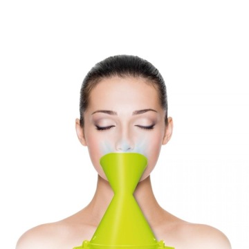 Anatomický trychtýřový tvar inhalační masky efektivně dopravuje páru k ústům a nosu bez úniků. Postranní držadla usnadňují malipulaci s inhalátorem. K dispozici je také uzamykatelný systém, který zabraňuje náhodnému otevření.